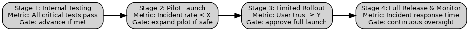 - Stage 3: Limited Rollout. The product is now proven in a small arena and enters a phased rollout – think of it as early access or a regional launch. Metric: a public trust or quality metric, such as user satisfaction (e.g. Net Promoter Score) or sustained reliability (uptime, error rate) at scale. For AI systems, it could include external audits of bias and factual accuracy. Decision Gate: leadership (and, where relevant, regulators or an ethics review board) formally approves full launch only if the product maintains performance standards at this intermediate scale. This is a final checkpoint to ensure that scaling up (to more users or markets) hasn’t introduced new problems. It’s also where compliance is verified – e.g. all regulatory requirements are met, and support systems (customer service, incident response) are in place for a broad audience. By collapsing the old “pillars” into this gate, we ensure legal, ethical, and market readiness is assessed alongside technical readiness, not as an afterthought.